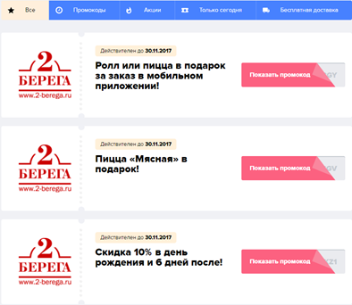 Выберите подходящий вам промокод на странице 2 Берега. Нажмите кнопку «Показать код». В открывшемся окне скопируйте промо-слово и нажмите «Перейти в магазин». Активируйте данный код в соответствующем поле перед оплатой заказа.