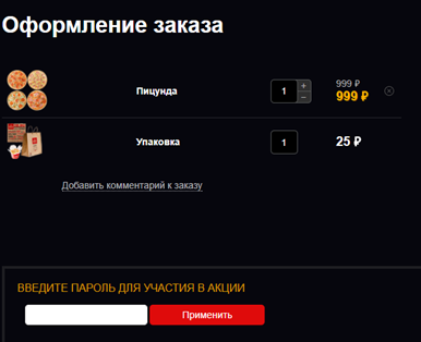 На сайте пиццерии выберите понравившееся блюдо из списка и добавьте его в корзину. При оформлении заказа в окошко «Введите пароль для участия в акции» вставьте полученный ранее промокод и нажмите «Применить».
